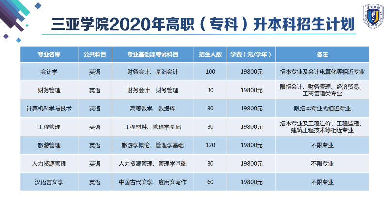 三亚学院作为海南专升本招生院校之一,有没有同学心动呢?琼台师范学院是一所民办全日制综合类本科院校,如果有考生对该院校感兴趣,可以先来了解一下院校发布的2020年三亚学院专升本招生简章,该简章中对院校的招生要求、录取规则及收费标准等都有说明。以下就是2020年三亚学院专升本招生简章的详细内容。