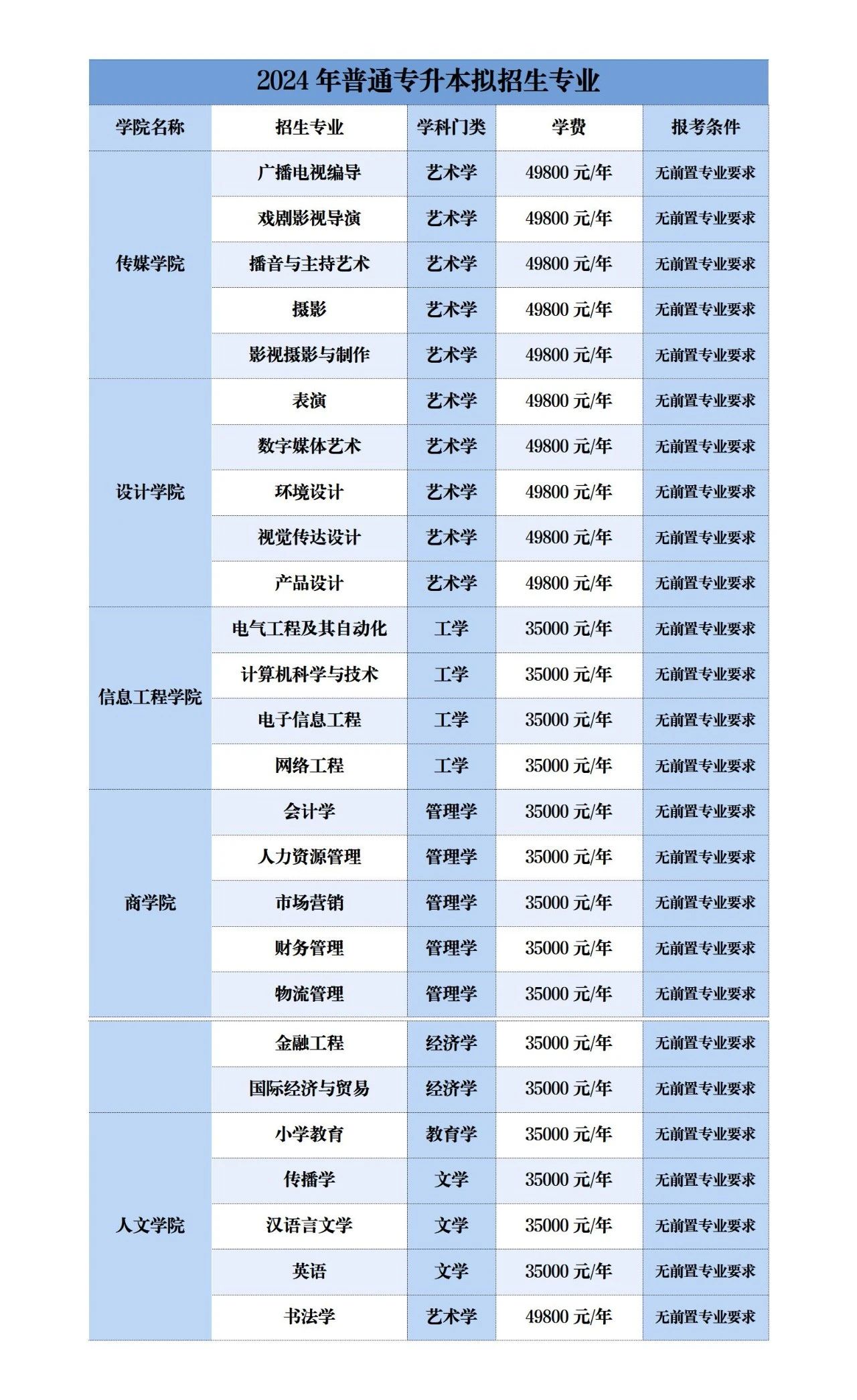 (三)普通专升本为国家任务生,秋季入学,全日制脱产学习。学校对普通专升本学生可采取插班就读、独立编班等形式开展教育教学,并按普通高等教育学生相关管理办法管理。普通专升本学生毕业时,其毕业证书上标注“在本校XX专业专科起点本科学习”,学习时间按进入本科阶段学习和颁发毕业证实际时间填写。