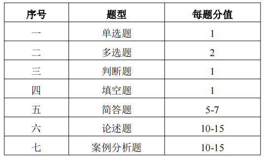 3.考试题型包括单选题、多选题、判断题、填空题、简答题、论述题、案例分析题等。