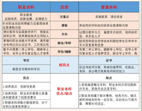 职业本科和普通本科的区别有培养目标、学位证书、学习内容、招生院校、就业前景、学历认可度、升学途径。总的来说区别还是挺大的,但都是全日制本科学历,享受同等待遇。目前不少省份都开始有职业本科招生专升本,因此同学们在报考的时候还是要慎重考虑,选择适合自己的院校,下面就和专升本网具体来了解职业本科和普通本科的区别有哪些吧!