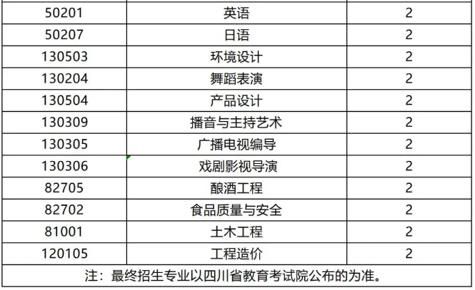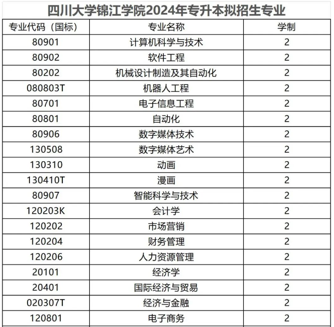 四川大学锦江学院2024专升本招生专业发布,计划招生专业为计算机科学与技术、软件工程、机械设计制造及其自动化、机器人工程、电子信息工程、自动化、数字媒体技术、数字媒体艺术、动画、漫画、智能科学与技术、会计学、市场营销、财务管理、人力资源管理、经济学、国际经济与贸易、经济与金融、电子商务、英语、日语、环境设计、舞蹈表演、产品设计、播音与主持艺术、广播电视编导、戏剧影视导演、酿酒工程、食品质量与安全、土木工程、工程造价。