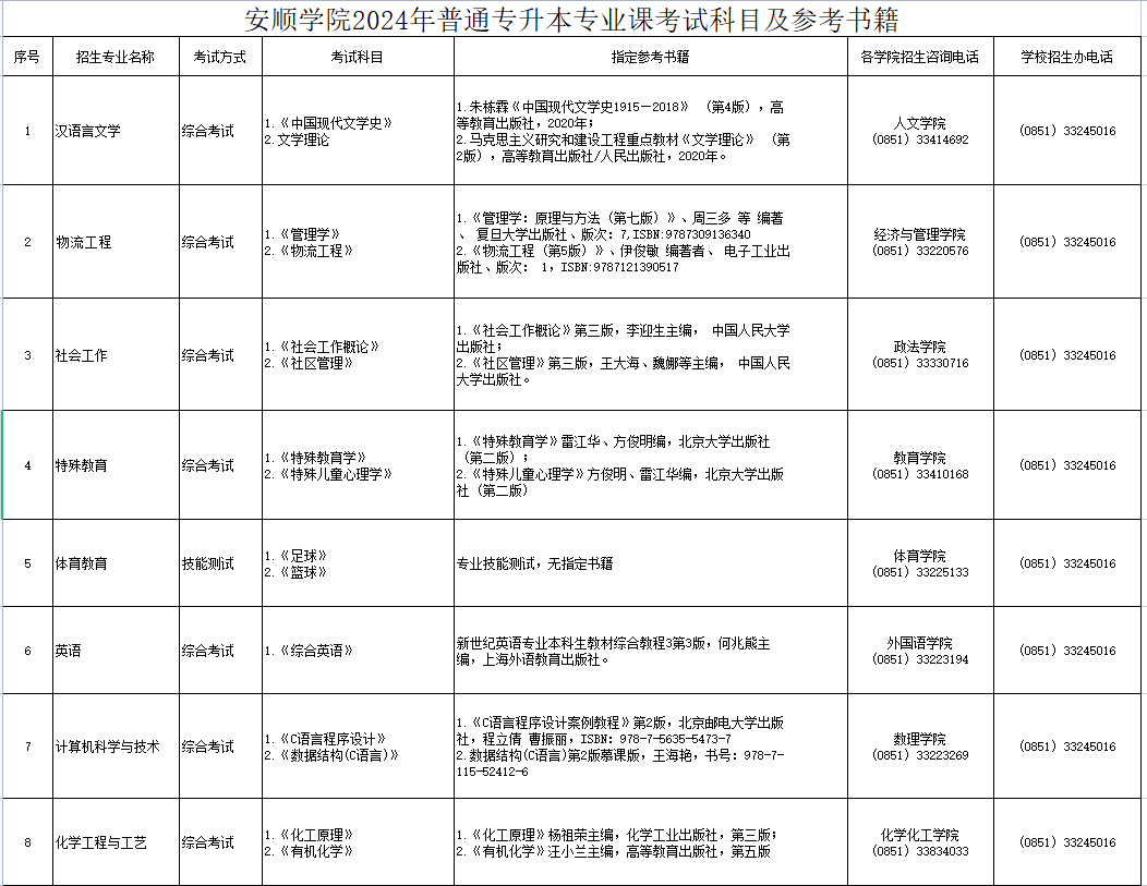 安顺学院2024年普通专升本拟招生15个专业,招生范围、考试科目及参考书目如下: