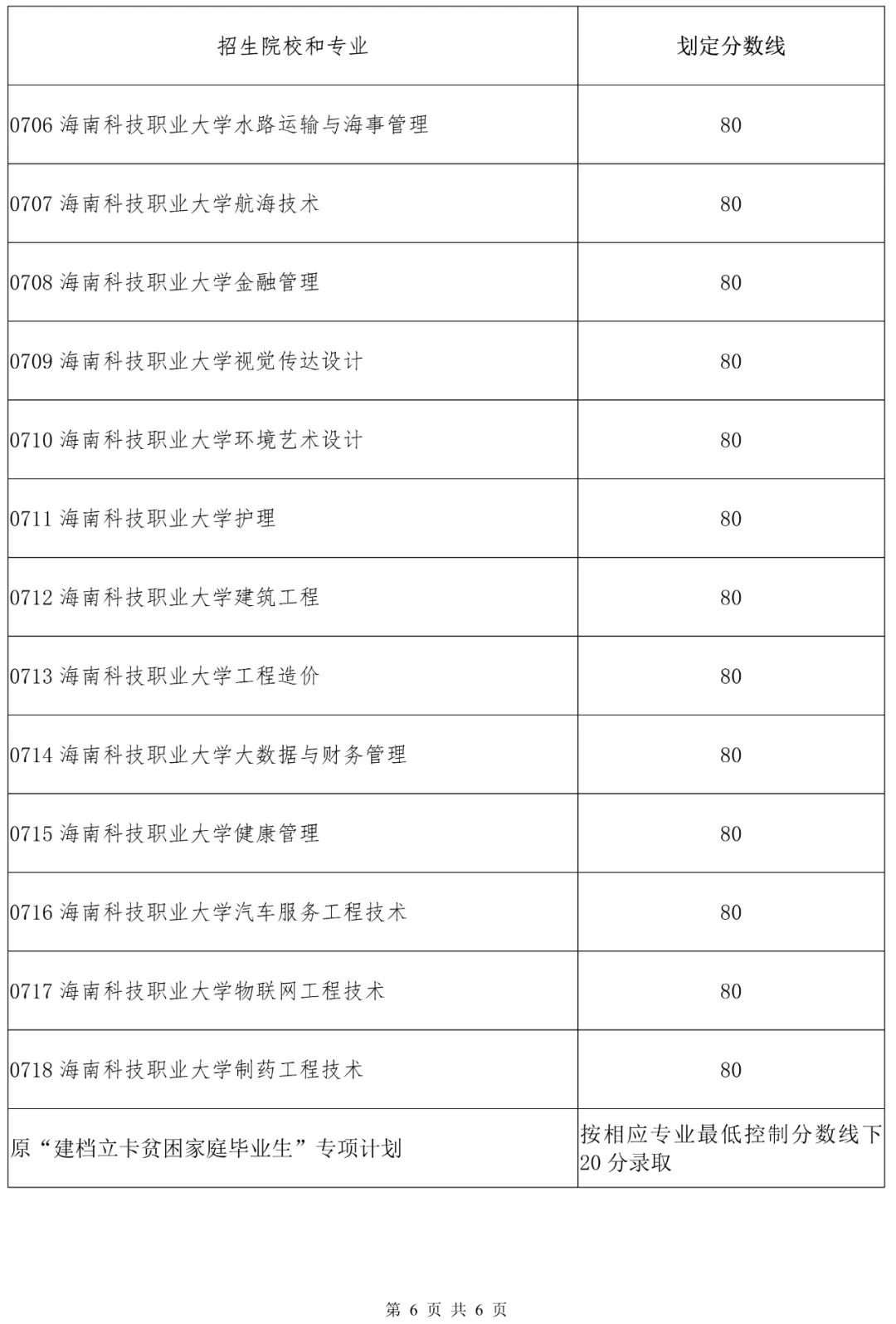 我省高职(专科)升本科招生录取分数线在考生成绩不低于80分,按照招生学校各专业计划数1:1比例划定。其中原“建档立卡贫困家庭毕业生”专项计划录取最低控制分数线为划定相应专业录取分数线下20分(详见附件1);“退役大学生士兵”专项计划由招生学校根据职业适应性或职业技能综合考察结果,并结合考生在校期间成绩、服役期间表现等情况综合评价,按照各专业招生计划数1:1的比例择优录取。考生成绩不低于划定报考学校相应专业的最低录取控制分数线,则确认为所报考学校相应专业预录取的考生,考生也可向报考学校查询本人的预录取信息。