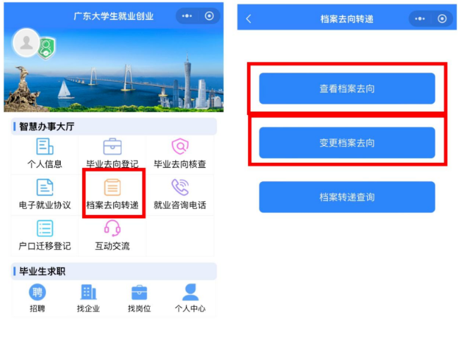 1.广东省院校的学生请在微信搜索“广东大学生就业创业”小程序,进入“档案去向转递”模块,按照学校实际情况,点击“查看档案去向”或“变更档案去向”。