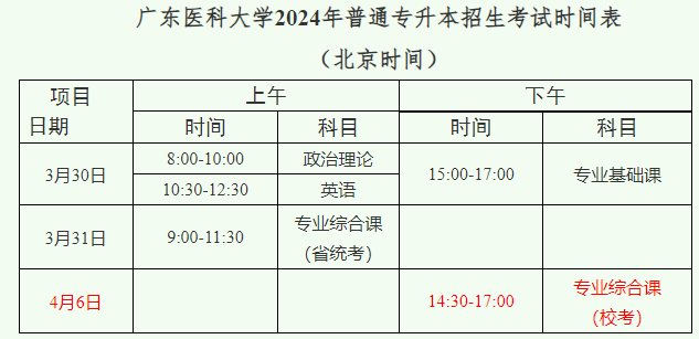 广东医科大学2024年普通专升本招生考试时间表(北京时间)